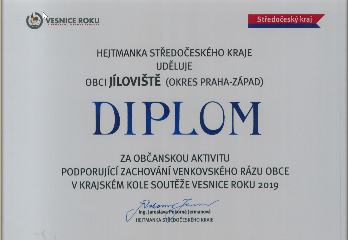 Obec Jíloviště byla v sobotu v Libovicích oceněna diplomem za udržení venkovského rázu obce v rámci soutěže Vesnice roku 2019.