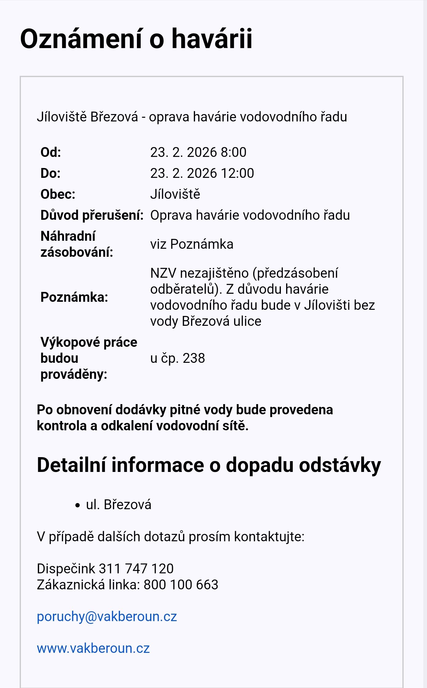 • Havárie Vodovodu 23.02.2026